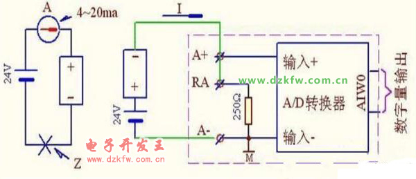 这样的:将左图电源负极与传感器输出的负极连线断开,将电源的负极接模块的 A-端,将传感器输出负极接 RA 端, RA 端与 A+ 端并接一起,这样由传感器负极输出的 4~20m