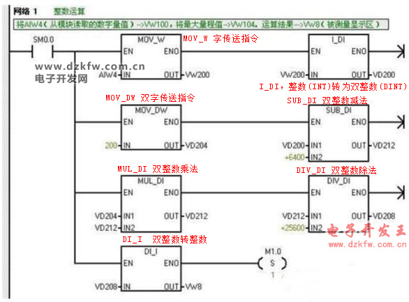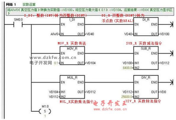 该梯形图是对一个真空压力变送器(量程:0~ 0.1Mpa, 输出:4~ 20ma )按公式(2-1)