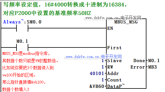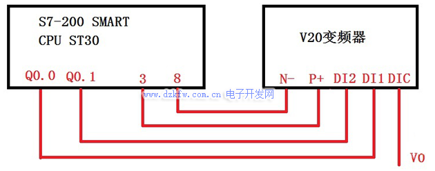 西门子PLC控制变频器时经常碰到需要频繁修改频率,只能选择用PLC通信来给定频率,在通过数字输出Q点来控制变频器启停正反转,从而实现PLC自动控制。在此我们以CPU ST30和V20变频器为例来讲解。硬件连接如下图所示: