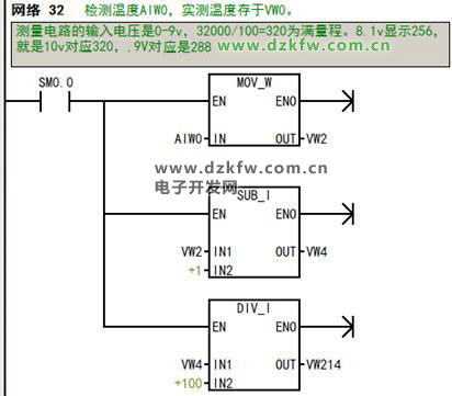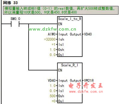 在这个指令库中,子程序Scale_I_to_R可用来进行模拟量输入到S7-200内部数据的转换;子程序Scale_R_I可用于内部数据到模拟量输出的转换。