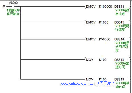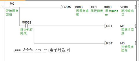 当按下M0的时候,Y0控制的伺服开始回原点,方向默认为当前值寄存器减少的方向,也就是图中的左方向。其中X0为原点sensor,工作台先以D800的速度往左移动,当X0感应到工作台时,再以D802继续往左移动,知道X0感应不到工作台时,工作台马上停止。此时当前值寄存器会自动清理,回原点指令执行完成。
