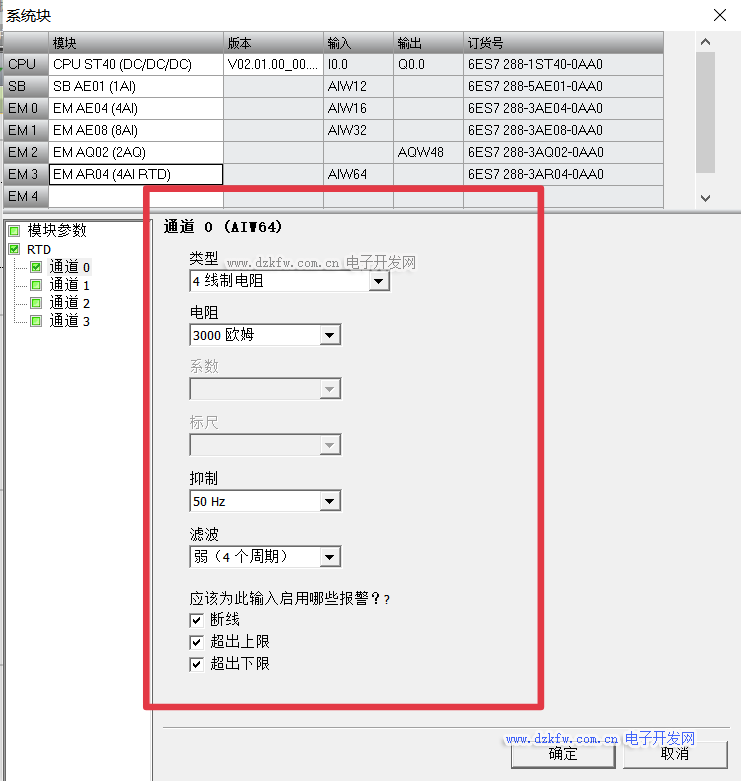 200 SMART RTD模块最大可以测量3000Ω的电阻值。如下图配置选择阻值量程范围例子。