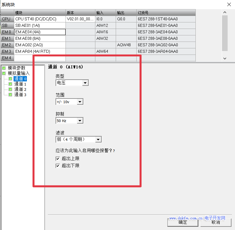 对于每条模拟量输入通道,都将类型组态为电压或电流。为通道0选择的类型也适用于通道1,为通道2选择的类型也适用于通 道3。