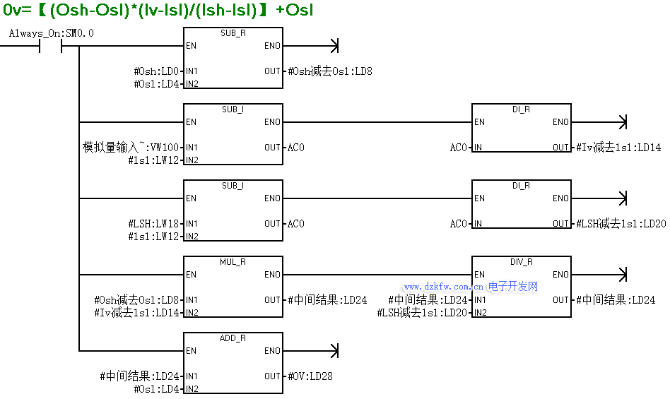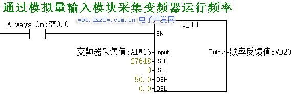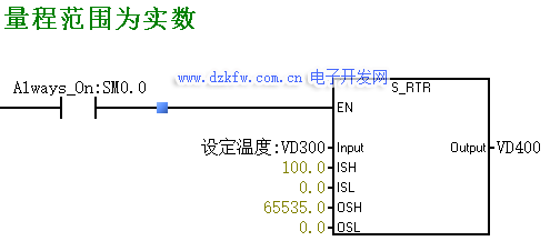 Isl为模拟量转换数字量的最小值,当模拟量模块采集的输入值AIWx 小于等于模拟量转换数字量的最小值时,将模拟量转换数字量的最小值时传送到实际采集值。当模拟量模块采集的输入值AIWx 大于模拟量转换数字量的最大值时,将模拟量转换数字量的最大值时传送到实际采集值,采集值在模拟量转换数字量的范围内时,将当前模拟量模块采集的输入值AIWx传送给实际采集值。根据Ov = [(Osh - Osl)*(Iv - Isl)/(Ish - Isl)] + Osl得到如下程序段: