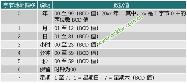 所有日期和时间值必须采用BCD格式(BCD码通俗的说法是用16进制的形式来表示2进制数)分配(例如,16#12 代表2012年)。00至99的BCD值范围可分配范围为2000至2099的年份;时间缓冲区如图2所示。