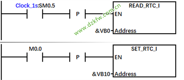 时钟指令的管脚T就是缓冲区的起始字节地址,可以由用户自由设置(在CPU允许的V存储区范围内)。如果设置T为VB10,那么读取时钟后,“年”的信息就会保存在VB10中,“月”保存在VB11中。