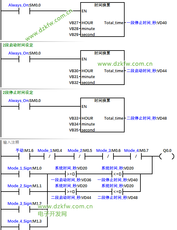 为了使各时段的启停时间更精准,可以把时分秒换算成秒的单位进行与系统时间比较。当系统时间≥设置的启动时间,同时系统时间≤设置的停止时间时,就可以输出风机运行。