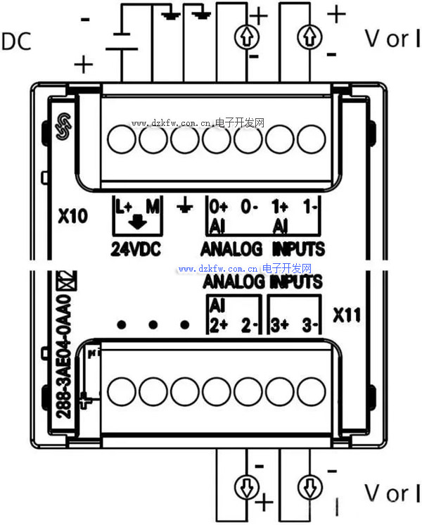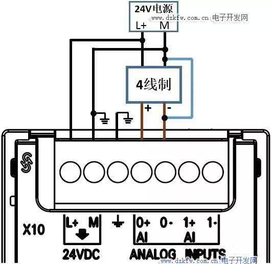 图1 模拟量模块接线 模拟量电流、电压信号根据模拟量仪表或设备线缆个数分成四线制、三线制、两线制三种类型,不同类型的信号其接线方式不同。四线制信号指的是模拟量仪表或设备上信号线和电源线加起来有4根线。仪表或设备有单独的供电电源,除了两个电源线还有两个信号线。四线制信号的接线方式如下图2模拟量电压/电流四线制接线所示。