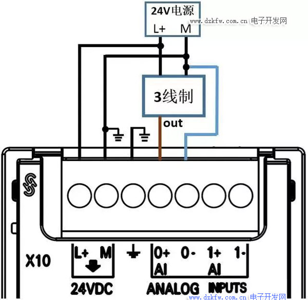 图2 模拟量电压/电流四线制接线 三线制信号是指仪表或设备上信号线和电源线加起来有3根线,负信号线与供电电源M线为公共线。三线制信号的接线方式如下图3 模拟量电压/电流三线制接线所示。