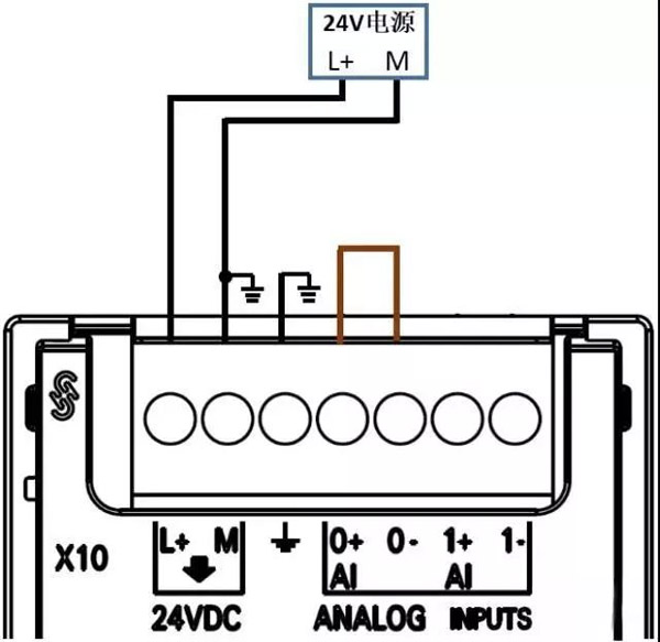 两线制信号指的是仪表或设备上信号线和电源线加起来只有两个接线端子。由于S7-200 SMART CPU模拟量模块通道没有供电功能,仪表或设备需要外接24V直流电源。两线制信号的接线方式如下图4 模拟量电压/电流两线制接线所示。