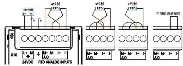RTD热电阻温度传感器有两线、三线和四线之分,其中四线传感器测温值是最准确的。S7-200 SMART EM RTD模块支持两线制、三线制和四线制的RTD传感器信号,可以测量PT100、PT1000、Ni100、Ni1000、Cu100等常见的RTD温度传感器,具体型号请查阅《S7-200 SMART系统手册》。S7-200 SMART EM RTD模块还可以检测电阻信号,电阻也有两线、三线和四线之分。EM RTD模块的接线方法如下图6 传感器RTD/电阻信号接线所示。