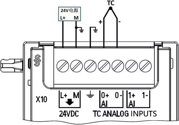 热电偶测量温度的基本原理是:两种不同成份的材质导体组成闭合回路,当两端存在温度梯度时回路中就会有电流通过,此时两端之间就存在电动势。S7-200 SMART EM TC模块可以测量J、K、T、E、R&S和N型等热电偶温度传感器,具体型号请查阅《S7-200 SMART系统手册》。TC模块的接线说明参考图7 TC信号接线。