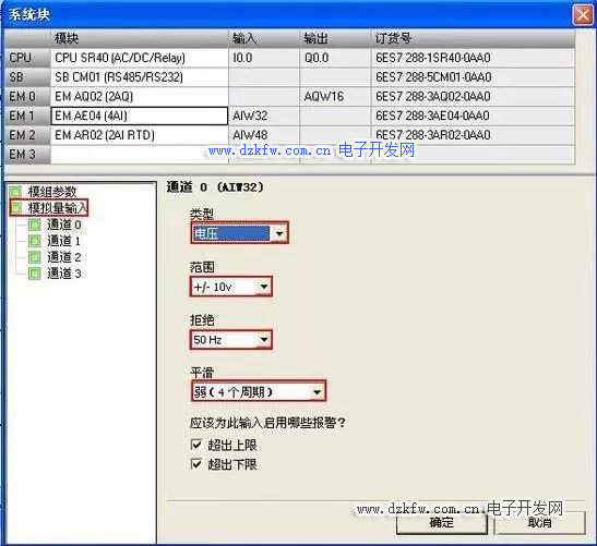 传感器的响应时间或传送模拟量信号至模块的信号线的长度和状况,也会引起模拟量输入值的波动。在这种情况下,波动值可能变化太快,导致程序逻辑无法有效响应。可组态模块对信号进行抑制,以在下列频率点消除或最小化噪声:● 10 Hz ● 50 Hz ● 60 Hz ● 400 Hz