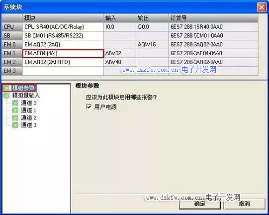 可为所选模块的所选通道选择是启用还是禁用以下报警:● 超出上限 ● 超出下限 ● 用户电源(在系统块'模块参数'(Module Parameters) 节点组态,参见下图。)