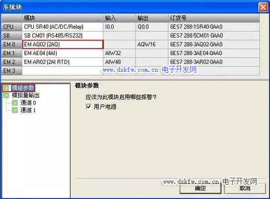单击'系统块'(System Block)对话框的'模拟量输出'(Analog Outputs) 节点为在顶部选择的模拟量输出模块组态选项。