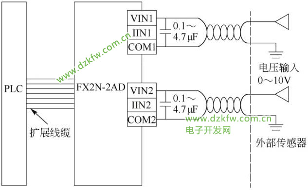 FX2N-2AD模块可以转换电流信号和电压信号,但其接线有所不同,外部电压信号与FX2N-2AD模块的连接如下图所示,传感器与模块的连接最好用双绞线,当模拟量的噪声或者波动较大时,在图中连接一个00.1~4.7μF的电容,VIN1和VIN2与电压信号的正信号相连,COM1和COM2与信号的低电平相连。FX2N-2AD模块的供电直接由PLC通过扩展电缆提供,并不需要外接电源。