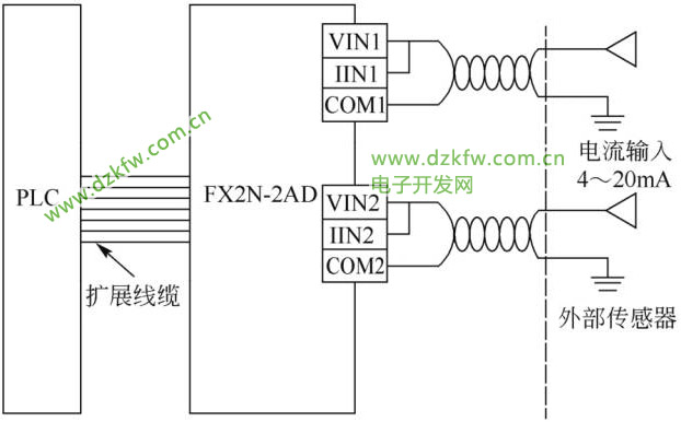 外部电流信号与FX2N-2AD模块的连接如下图所示,传感器与模块的连接最好用双绞线,IIN1和IIN2与电流信号的正信号相连,COM1和COM2与信号的低电平相连。VIN1和IIN1短接,VIN2和IIN2短接。