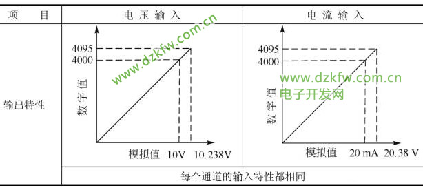 ② 模块的转换位数为12位,对应的数字为2的12次方减1=4095,但实际应用时,为了计算方便,通常情况下都将最大模拟量输入(DC 10V或20mA)所对应的数字量设定为4000,A/D转换的输出特性见下表1。