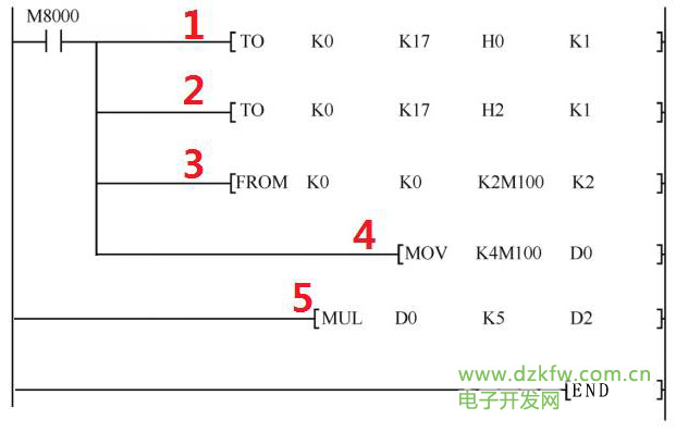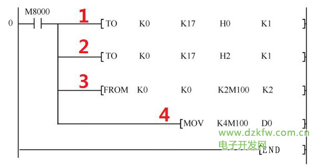 1:BFM#17的bit0 写入0值,代表我们选择FX2N-2AD 模块的第一个通道来采取压力变送器的信号。