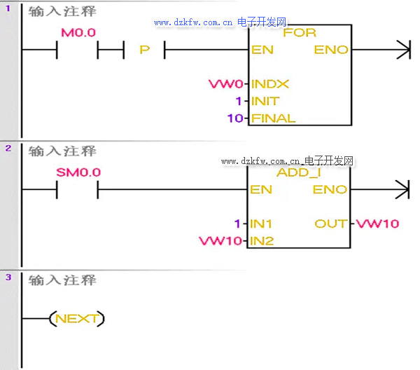 循环指令由FOR和NEXT两条指令构成,使用时必须成对出现,FOR…NEXT指令中间的程序称为循环体,就是PLC每次扫描到此处时需要循环执行的程序。