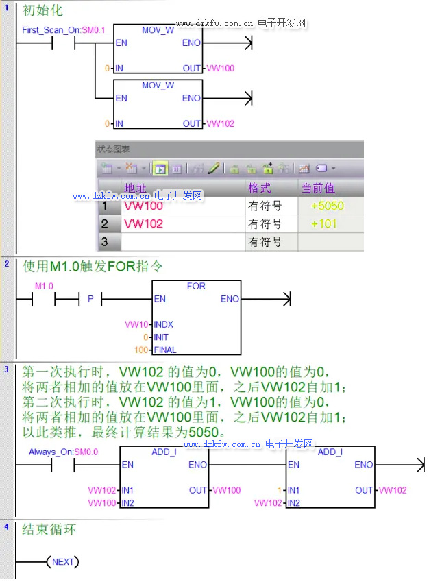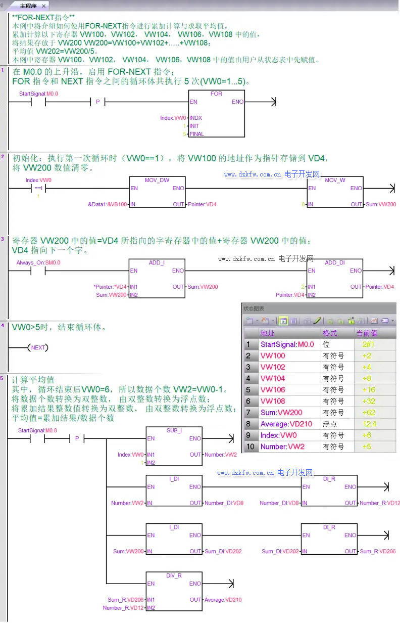 例程2:通过 FOR-NEXT 指令,对 5 个变量:VW100、VW102、VW104、VW106、VW108 进行求和,求和结果放到 VW200 中,计算的平均值存放在 VD210 中 。