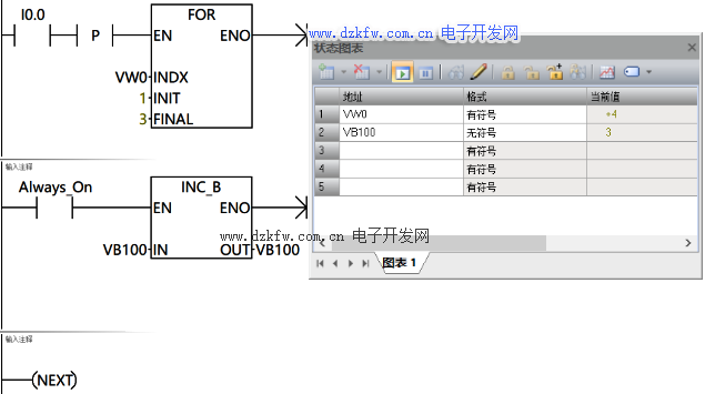 当I0.0为ON时接通一个上升沿脉冲触发FOR指令EN端循环3次,VB100值等于3。