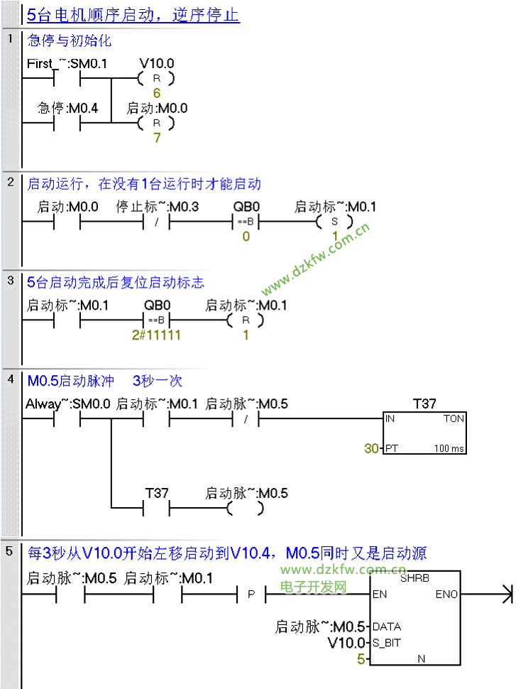 1、5台电机每3秒启动一台,顺序启动从Q0.0-Q0.4.