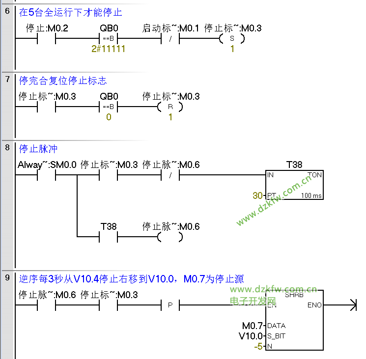 停止时,为实现逆序停止,N设定为-5,停止脉冲为M0.6(不能作为停止源),停止源是M0.7保证是0,从V0.4-V0.0置位每3秒置为0,实现逆序停止。程序如下: