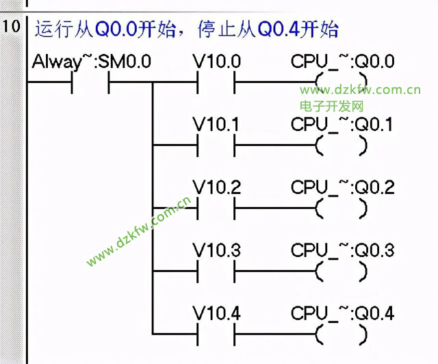 2、停止时要求逆序停止,从Q0.4-Q0.0,间隔时间3秒。