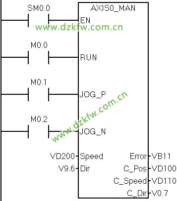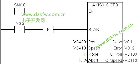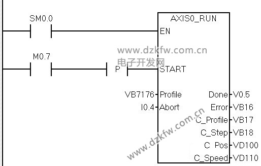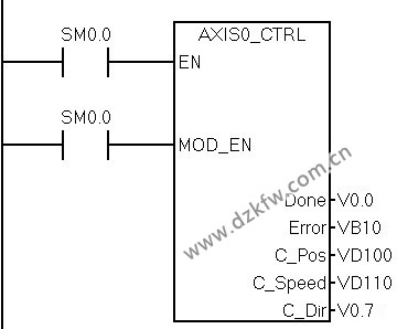 在项目中只对每条运动轴使用此子程序一次,并确保程序会在每次扫描时调用此子程序。使用 SM0.0(始终开启)作为 EN 参数的输入。