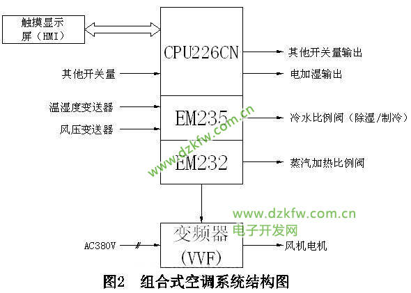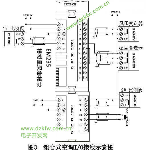 自控系统采用西门子CPU226CN为控制核心的PLC,由温湿变送器采集0-10V的温湿度信号送到A/D模块EM235,通过PLC的PID运算,输出D/A模块EM232由信号0-10V调节控制比例阀的运行控制温湿度;风量变送器采集0-10V的风量信号经过变换和计算,输出控制变频器的运行控制风量。所有控制状态和有关数据可以在触摸屏(HMI)监控显示。控制系统构成如图2所示,I/O接线示意图如图3所示,触摸屏(HMI)监控图如图4所示。