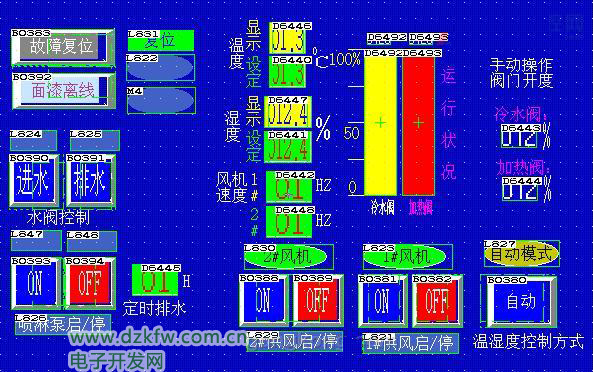 温湿度变送器分别采集生产线温、湿度实际值后,经A/D变换把信号送到CPU与设定值比较。根据计算结果,控制器输出相应信号自动控制比例调节阀,来调节冷量、蒸汽量,确保房间温、湿度达到