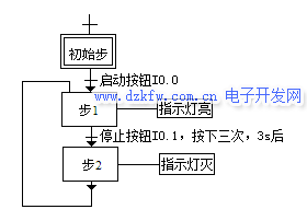 要求:一个指示灯,按下启动按钮指示灯点亮,按下停止按钮3次的时候延时4s指示灯灭,请写出梯形图和顺序功能图