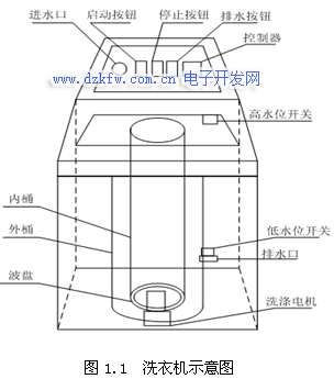 水管将水注入到外桶。排水时,通过电控系统使排水阀打开,将水由外桶排出到机外。洗涤正转、反转由洗涤电动机驱动波盘正、反转来实现,此时脱水桶并不旋转。脱水时,通过电控系统将离合器合上,由洗涤电动机带动内桶正转进行甩干。高、低水位开关分别用来检测高、低水位。启动按钮用来启动洗衣机工作。停止按钮用来实现手动停止进水、排水、脱水及报警。排水按钮用来实现手动排水。波轮式全自动洗衣机的实物示意图如图1.1所示。