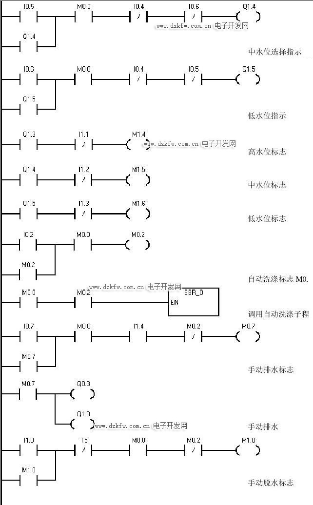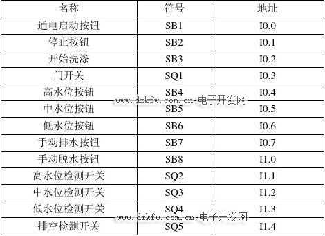 全自动洗衣机控制系统的输入有启动、停止、高水位、中水位、低水位、手动排水和手动脱水按钮以及高水位、中水位、低水位和排空检测开关等共15个输入点。具体的输入分配如表3-1所示。