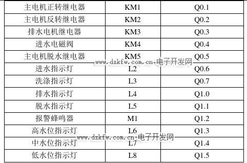 全自动洗衣机控制系统的外部设备有进水电磁阀、排水电机继电器、主电机正/反转洗涤继电器、蜂鸣器、指示灯等。具体的输出分配如表3-2所示。
