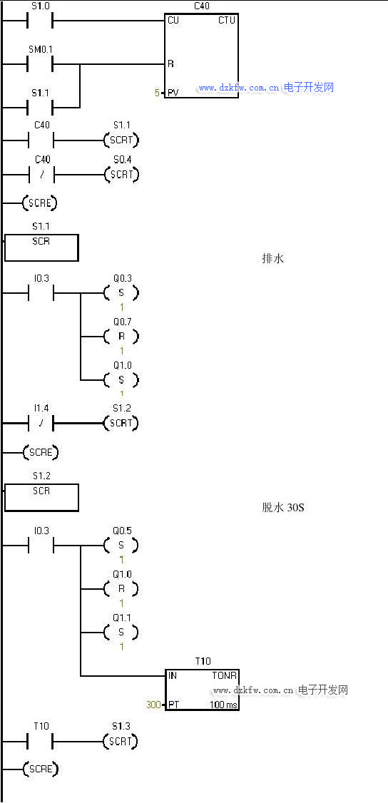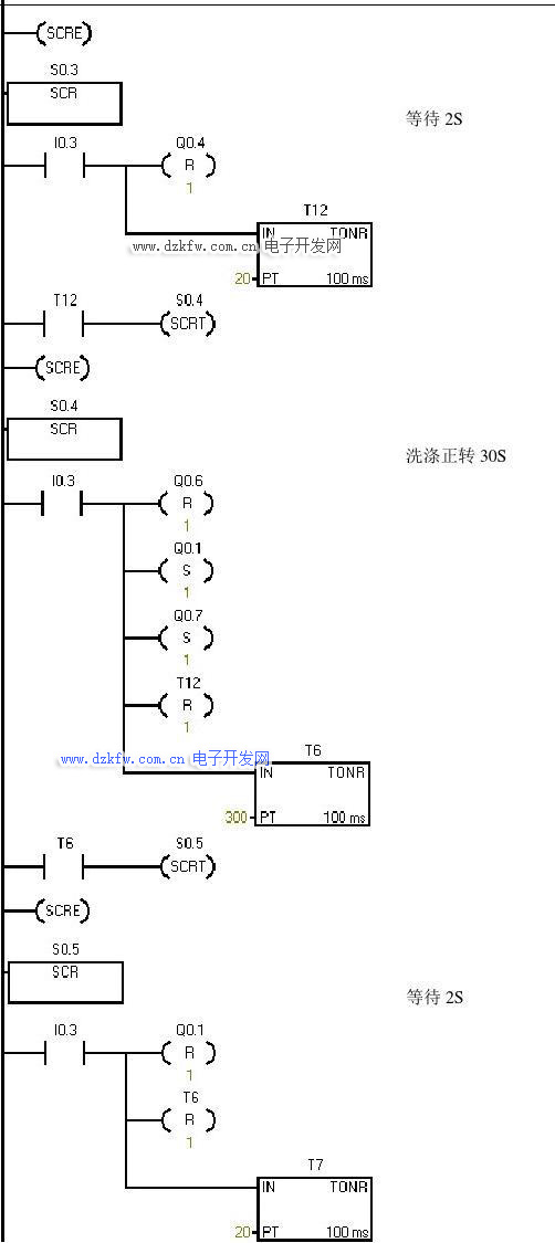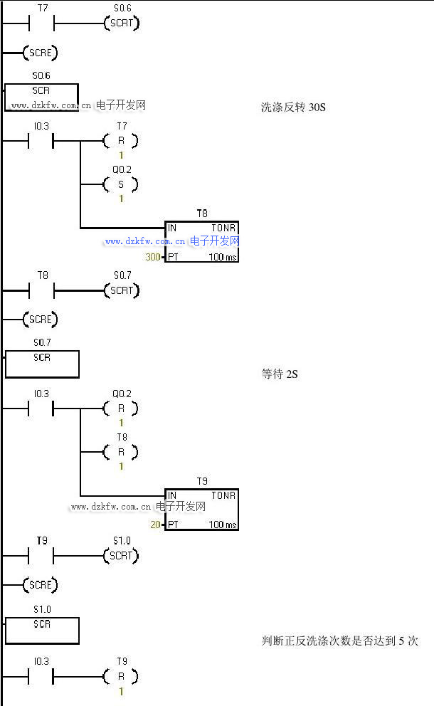 (3) 洗涤时,正转30秒,停2秒,然后反转30秒,停2秒 (4) 如此循环5次,总共320秒后开始排水,排空后脱水30秒 (5) 开始清洗,重复(1)~(4),清洗两遍 (6) 清洗完成,报警3秒并自动停机