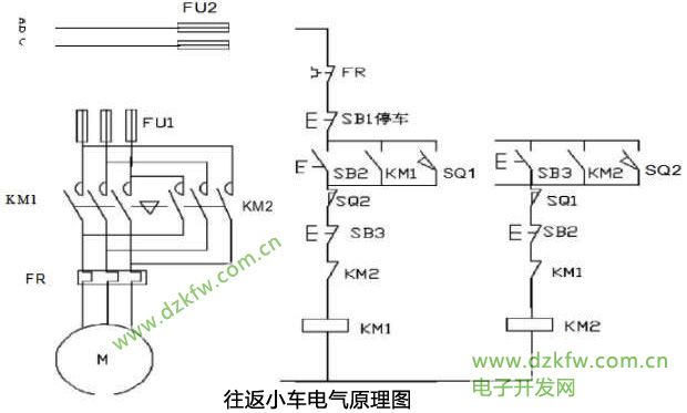 按下启动按钮 ,小车从左边往右边(右边往左边运动), 当运动到右边(左边)碰到右边(左边)的行程开关后,小车自动做返回运动,当碰到另一边的行程开关后,再次做返回运动 。如此往返运动,直到当按下停车按钮后小车停止运动。