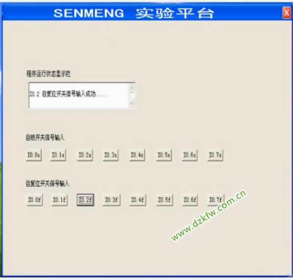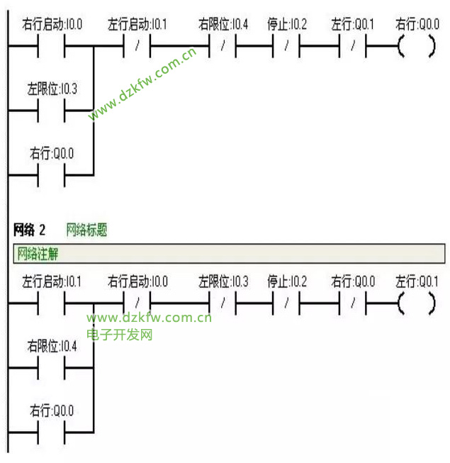 当按下SB2即i0.0(鼠标点击i0.0f)接通后,Q0.0接通,小车右行(即指示 灯 Q0.0 亮)。当小车运行碰到右限位开关SQ2即i0.4(用鼠标点击i0.4f,模拟SQ2被压下)接通,此时小车左行(指示灯Q0.0灭,指示灯Q0.1亮),当运行到左边碰到左限位SQ1即i0.3(鼠标点击i0.3f)接通,此时小车又往右运行(指示灯Q0.1灭,指示灯Q0.0 亮)。如此往返运动下去,直到按下SB1即i0.2(鼠标点i0.2f)接通,小车停止运行。