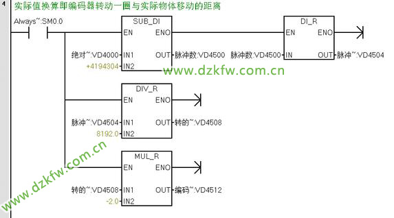 4.计算实际体的位移值,比如说编码器转动一圈会产生一个脉冲数的变化,根据这个脉冲数的变化与实际的位移进行一个换算,这样可以将物体实际产生的位移在PLC内部计算出来。大家可以看下这个实例的的功能。看看能不能推出来,编码器转动一圈的脉冲数和实际的位移。