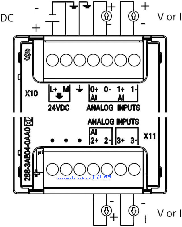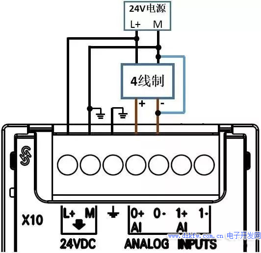 图1 模拟量模块接线 模拟量电流、电压信号根据模拟量仪表或设备线缆个数分成四线制、三线制、两线制三种类型,不同类型的信号其接线方式不同。 四线制信号指的是模拟量仪表或设备上信号线和电源线加起来有4根线。仪表或设备有单独的供电电源,除了两个电源线还有两个信号线。四线制信号的接线方式如下图2模拟量电压/电流四线制接线所示。