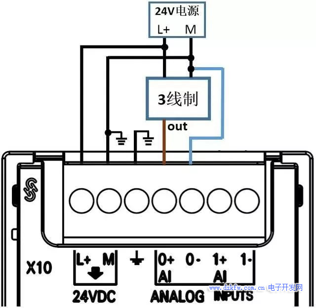 图2 模拟量电压/电流四线制接线 三线制信号是指仪表或设备上信号线和电源线加起来有3根线,负信号线与供电电源M线为公共线。三线制信号的接线方式如下图3 模拟量电压/电流三线制接线所示。