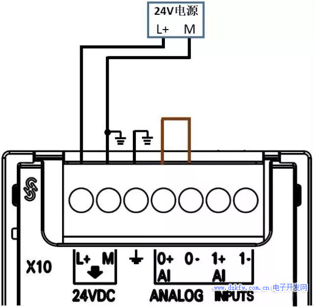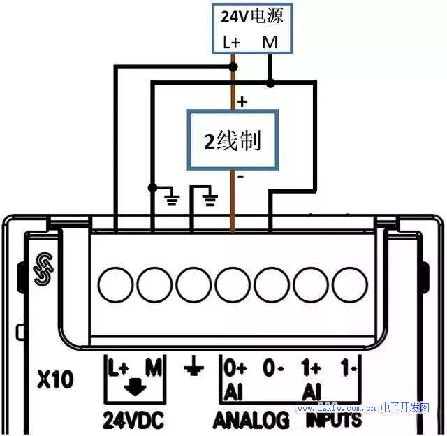 两线制信号指的是仪表或设备上信号线和电源线加起来只有两个接线端子。由于S7-200 SMART CPU模拟量模块通道没有供电功能,仪表或设备需要外接24V直流电源。两线制信号的接线方式如下图4 模拟量电压/电流两线制接线所示。