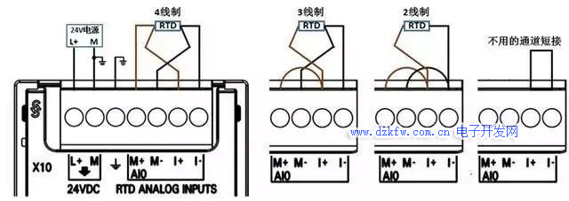 RTD热电阻温度传感器有两线、三线和四线之分,其中四线传感器测温值是最准确的。S7-200 SMART EM RTD模块支持两线制、三线制和四线制的RTD传感器信号,可以测量PT100、PT1000、Ni100、Ni1000、Cu100等常见的RTD温度传感器,具体型号请查阅《S7-200 SMART系统手册》。 S7-200 SMART EM RTD模块还可以检测电阻信号,电阻也有两线、三线和四线之分。 EM RTD模块的接线方法如下图6 传感器RTD/电阻信号接线所示。