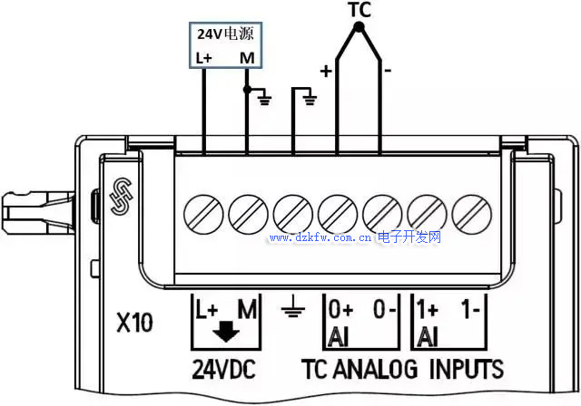 热电偶测量温度的基本原理是:两种不同成份的材质导体组成闭合回路,当两端存在温度梯度时回路中就会有电流通过,此时两端之间就存在电动势。 S7-200 SMART EM TC模块可以测量J、K、T、E、R&S和N型等热电偶温度传感器,具体型号请查阅《S7-200 SMART系统手册》。 TC模块的接线说明参考图7 TC信号接线。