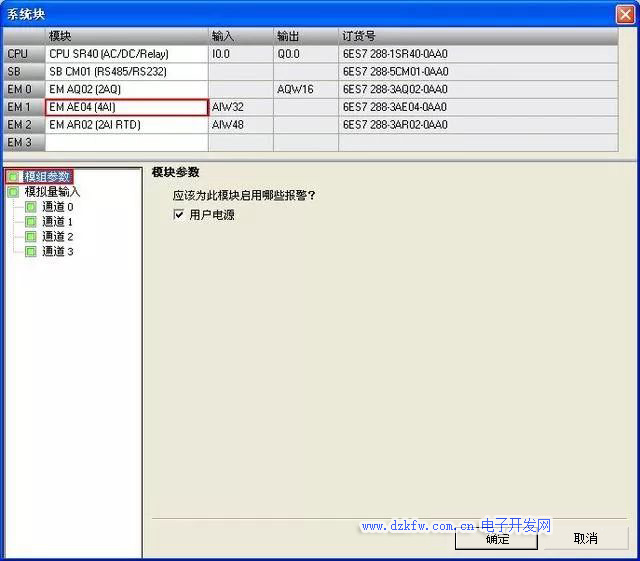 可为所选模块的所选通道选择是启用还是禁用以下报警: ● 超出上限 ● 超出下限 ● 用户电源(在系统块'模块参数'(Module Parameters) 节点组态,参见下图。)