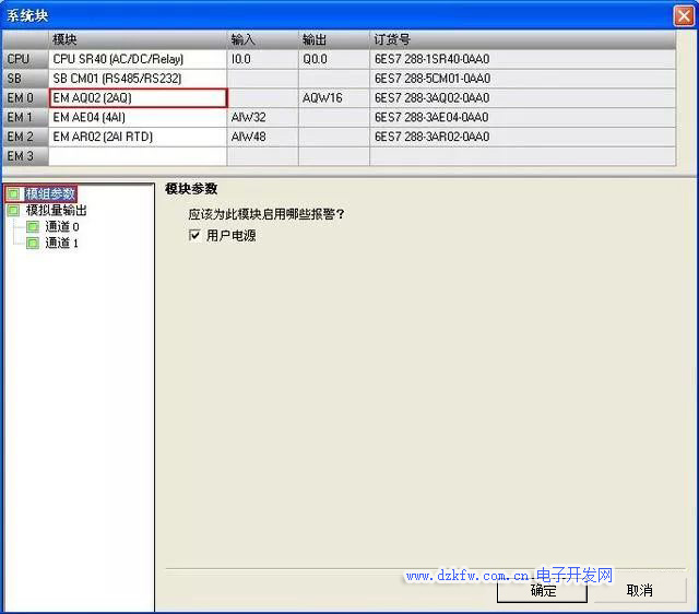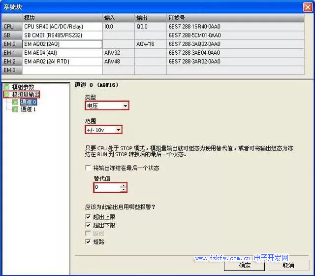 单击'系统块'(System Block)对话框的'模拟量输出'(Analog Outputs) 节点为在顶部选择的模拟量输出模块组态选项。