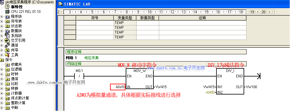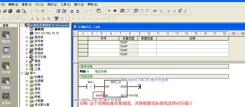 采用STEP7-Micro/win编程软件编写PLC程序,实现S7-200PLC模拟电压的采集,并将采集到的电压值(数字量形式)放入寄存器VW100中。