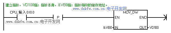 使用间接寻址之前,应创建一个指针。指针以双字的形式存储要访问的存储器的地址,只能用V存储器、L存储器或者累加器AC作为指针。建立指针时,用双字传送指令MOVD将需要间接寻址的存储器起始地址送到指针中。指针的输入数应该以“&”符号开头来表明存储区的地址,注意不是其内容将移动到指令的输出操作数中。