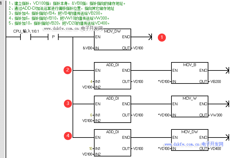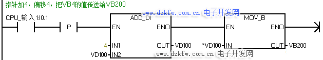 (2)将指针通过ADD_DI(加整数指令)进行加4,从而指针指向VB4,后再将VB4通过MOV_B(字节传送指令)把VB4传送给VB200。